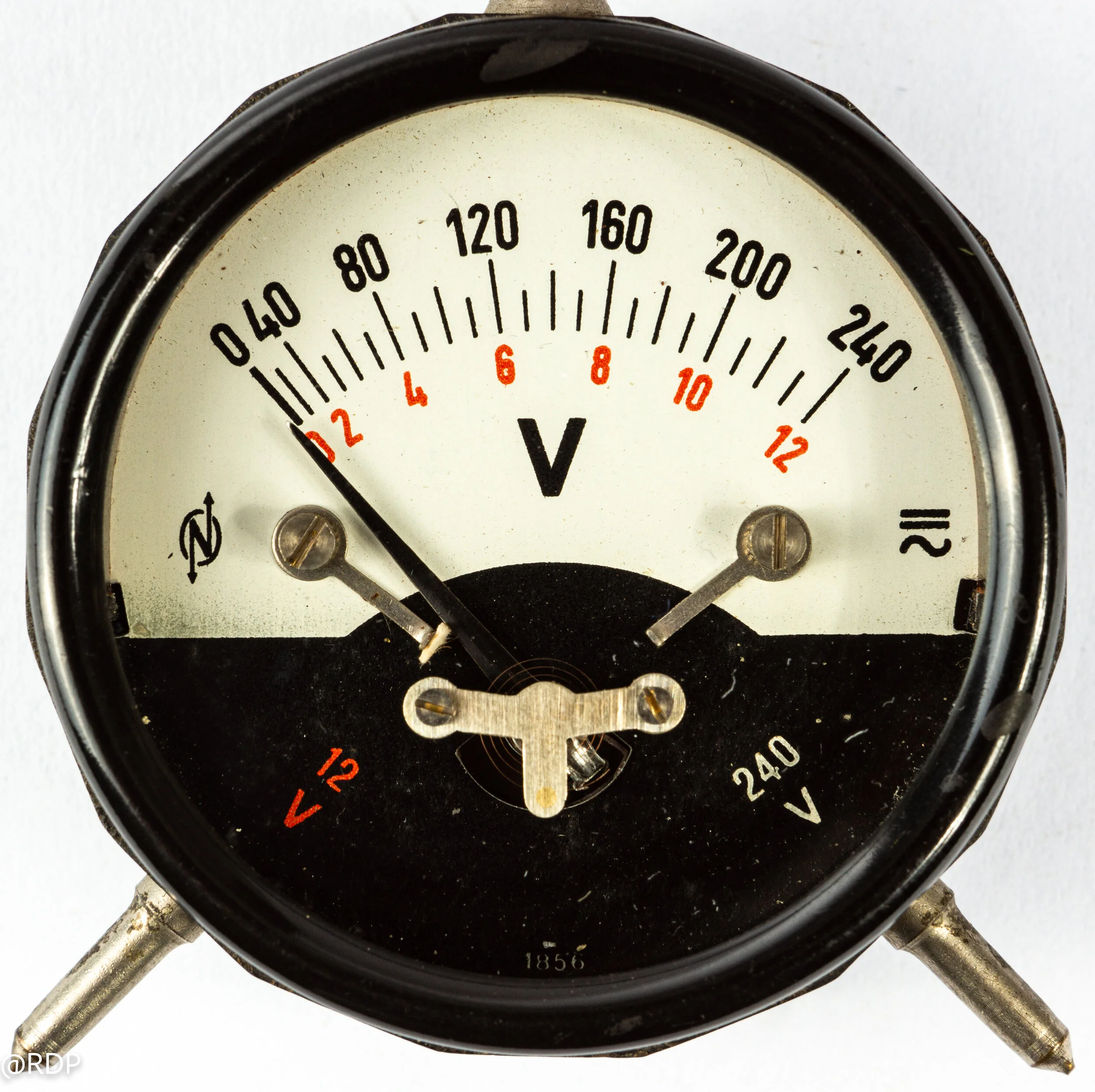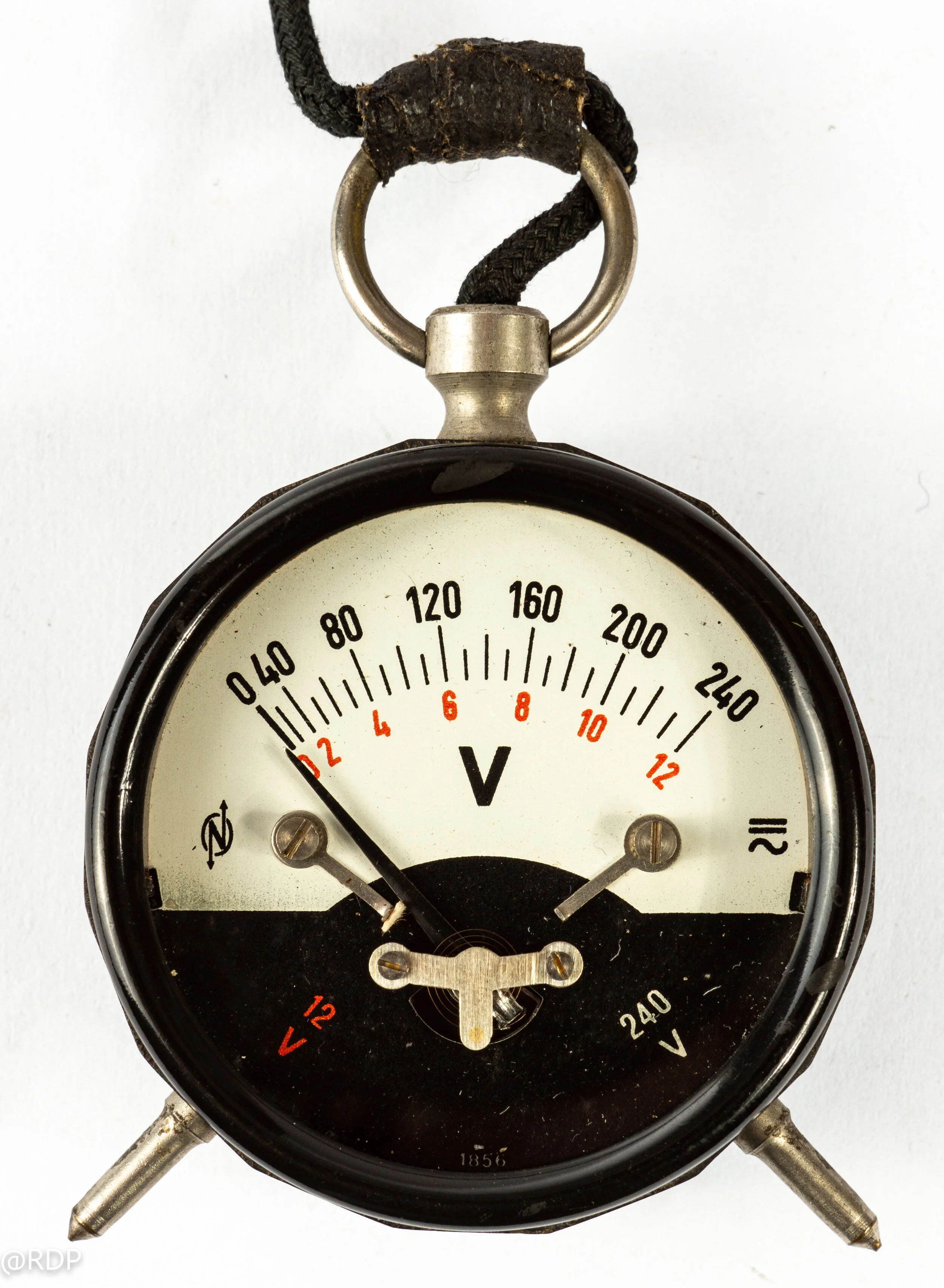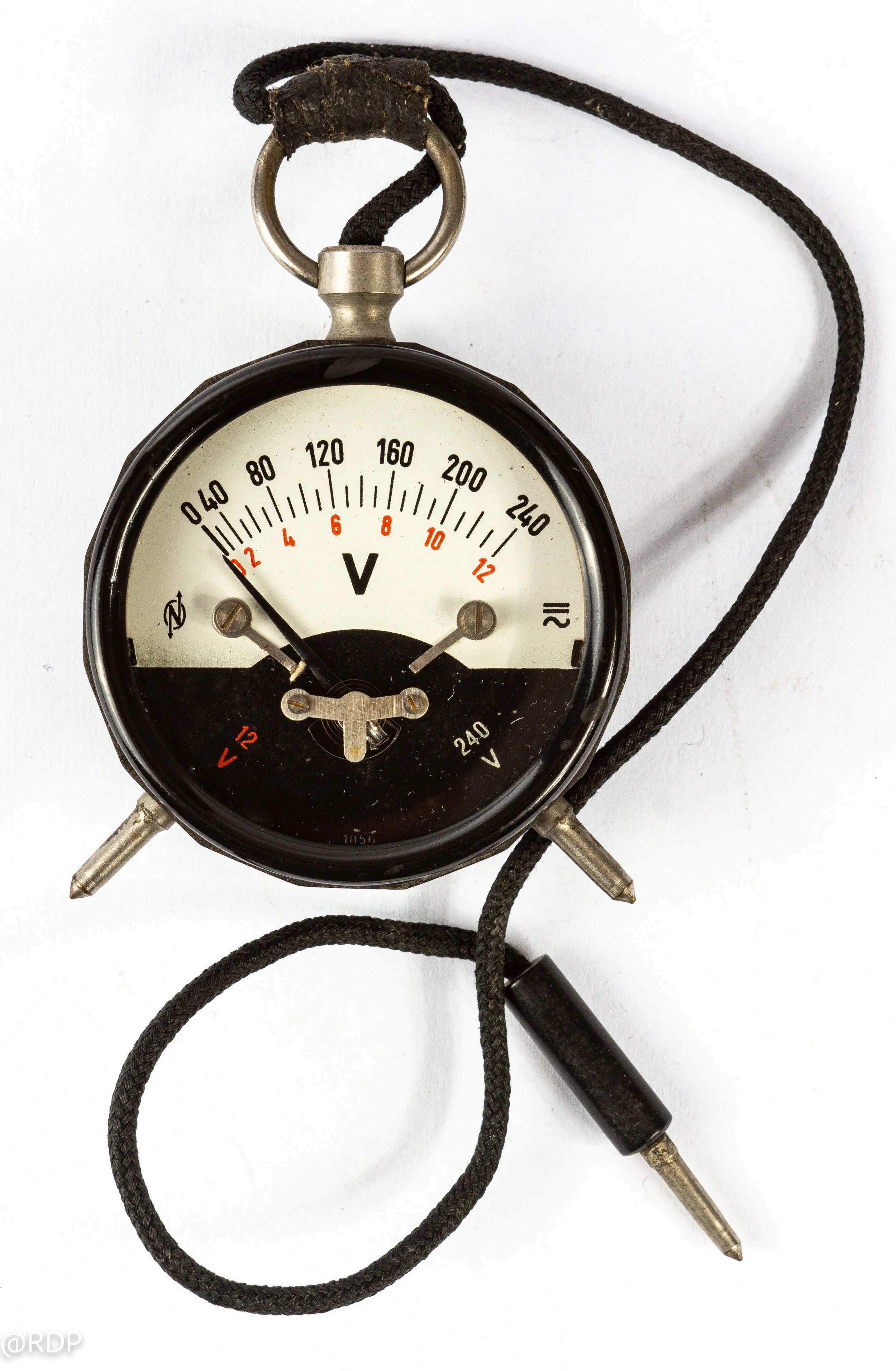 Pocket voltmeter with 2 ranges. By using one of either test pins attached to the case (looks black plastic), either the 12V or the 240V can be selected.