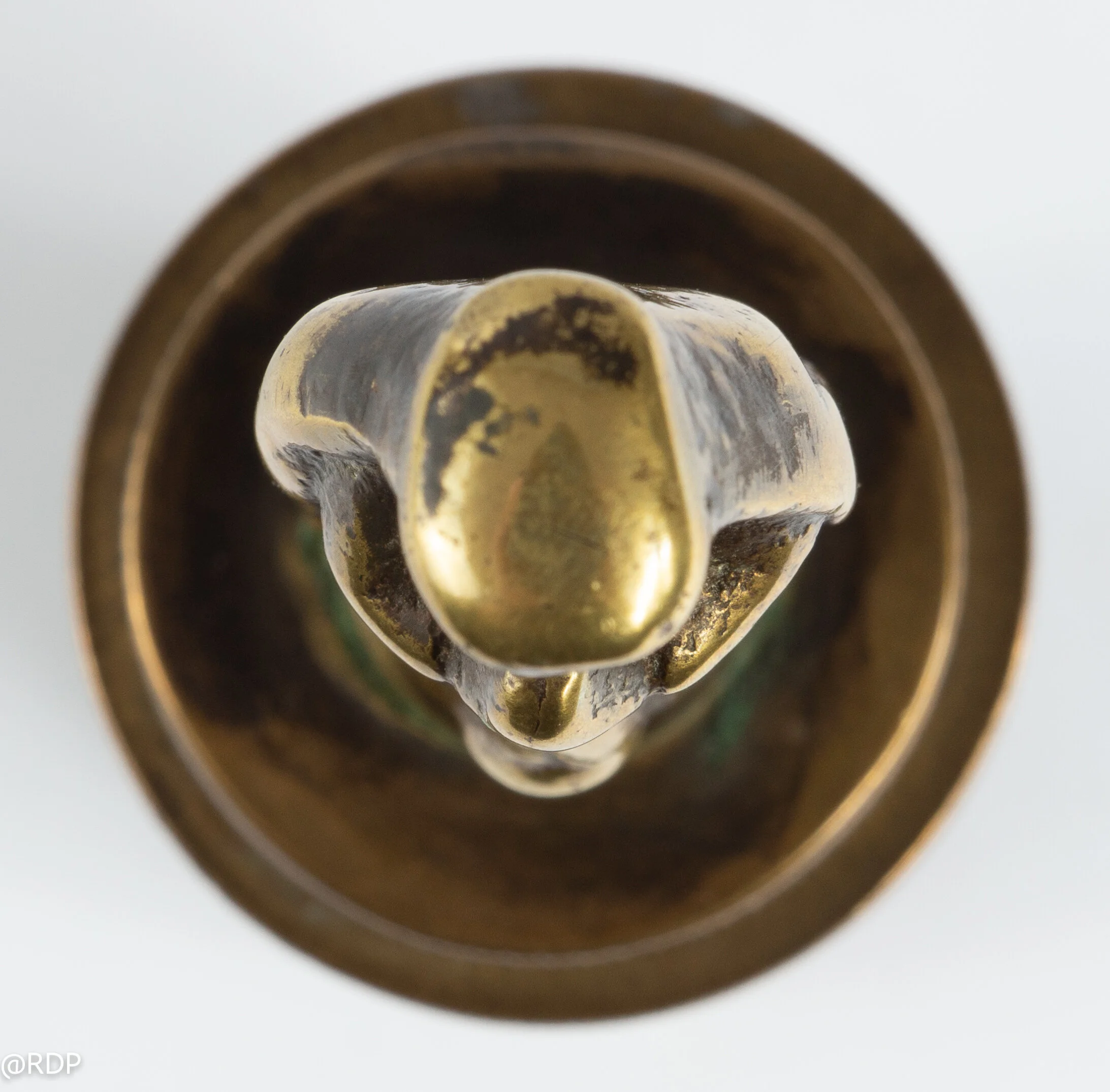 Plumb line made from 30mm bullet shell. On the screw cap, would assume statue of Maria, but not sure. On the plumb itself, also a small statue, but seems rather an aristocratic figure. The bottom has a steel point and can be unscrewed from the statue. Assume this could have been part of a bullet?
